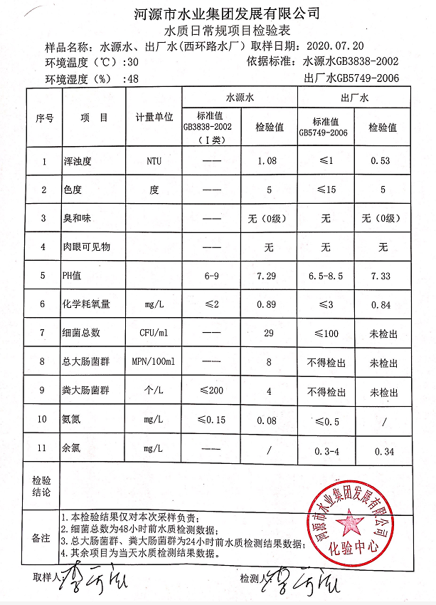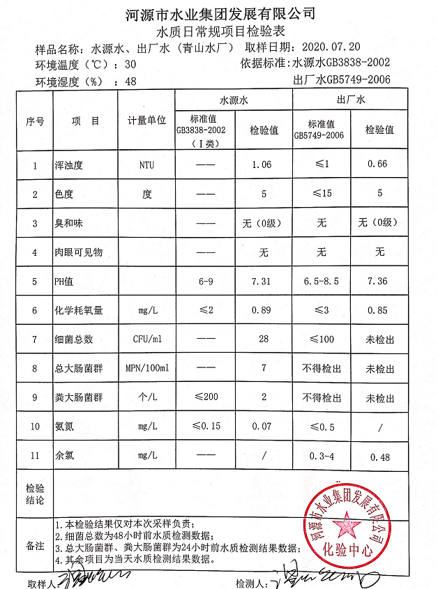 2020年7月20日水質檢驗報告