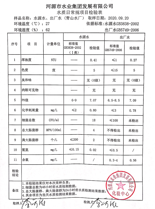 2020年9月20日水質檢驗報告