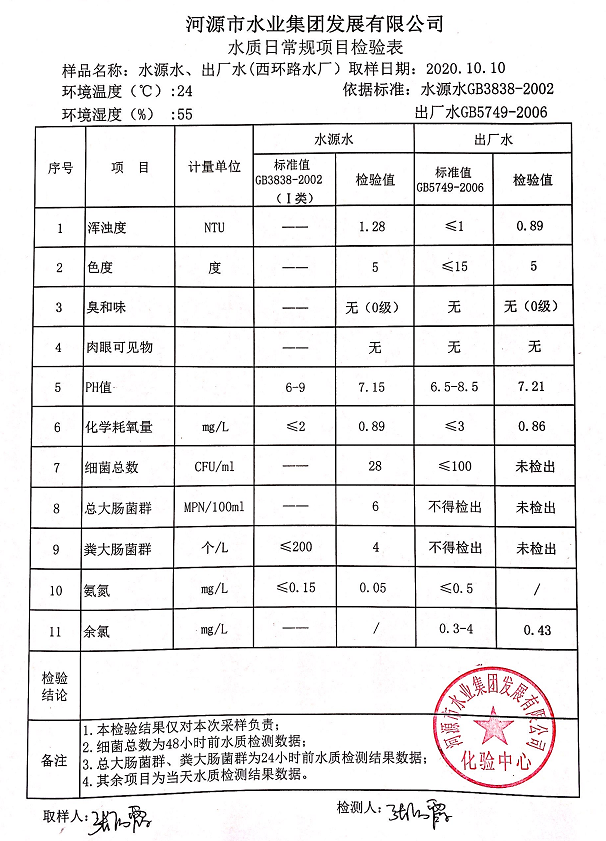 2020年10月10日水質(zhì)檢驗報告