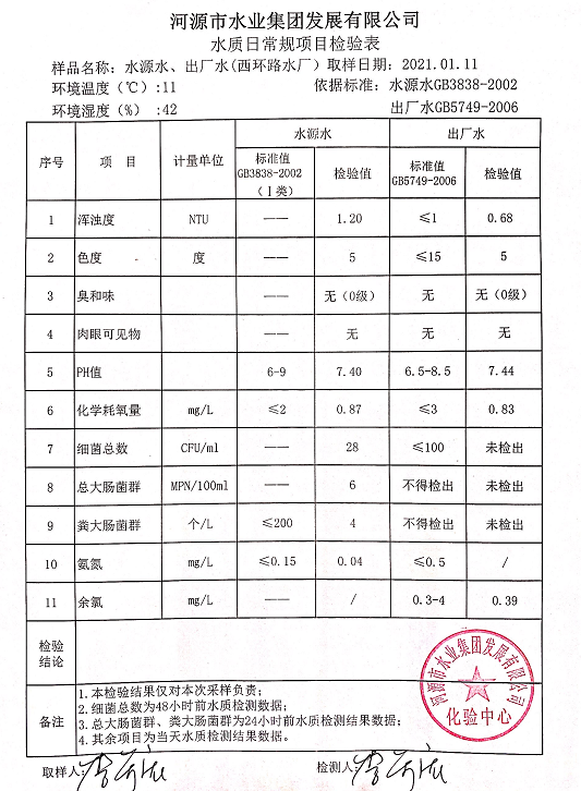 2021年1月11日水質(zhì)檢驗報告