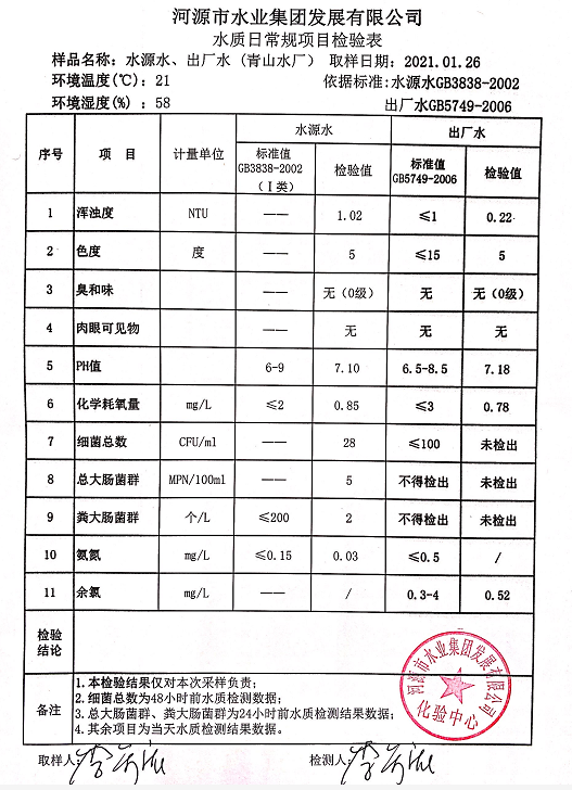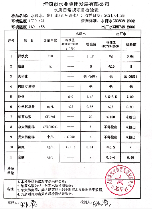 2021年1月26日水質檢驗報告