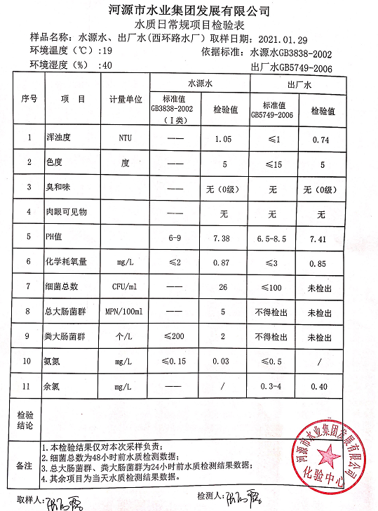 2021年1月29日水質檢驗報告