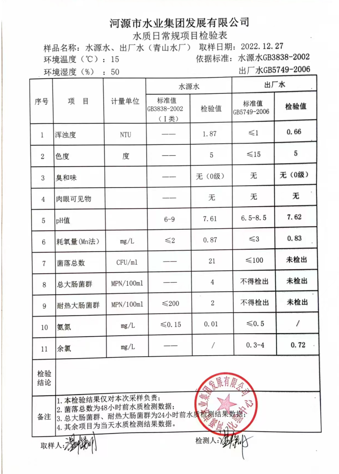 2022年12月27日水質檢驗報告