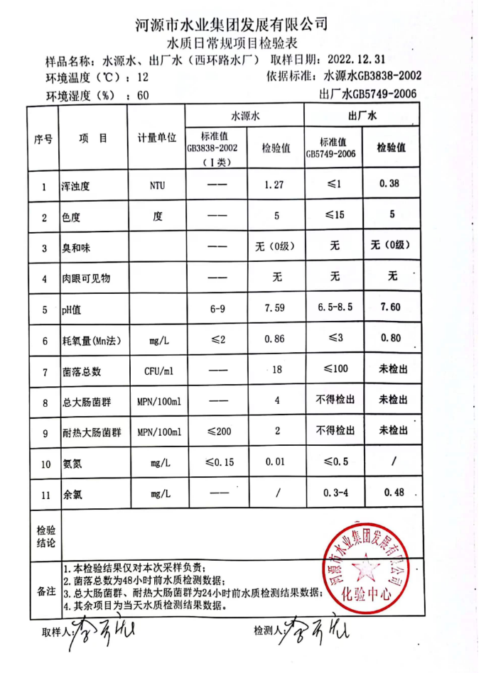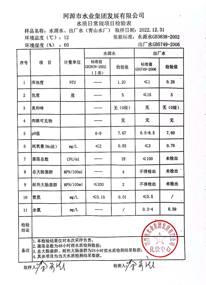 2022年12月31日水質檢驗報告
