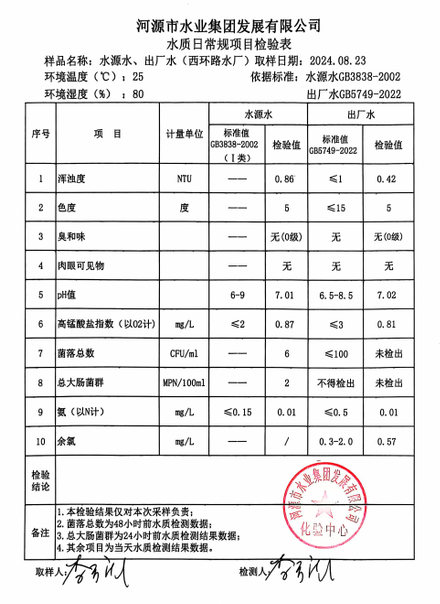 2024年8月23日水質(zhì)檢驗(yàn)報(bào)告