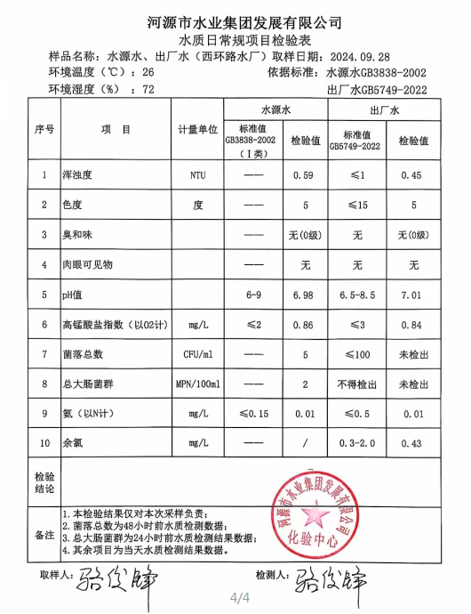 2024年9月28日水質(zhì)檢驗(yàn)報(bào)告